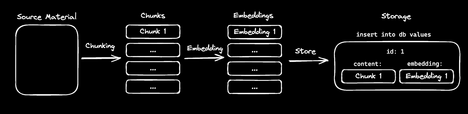 Currently, your application has one table (resources) which has a column (content) for storing content. Remember, each resource (source material) will have to be chunked, embedded, and then stored. Let’s create a table called embeddings to store these chunks.