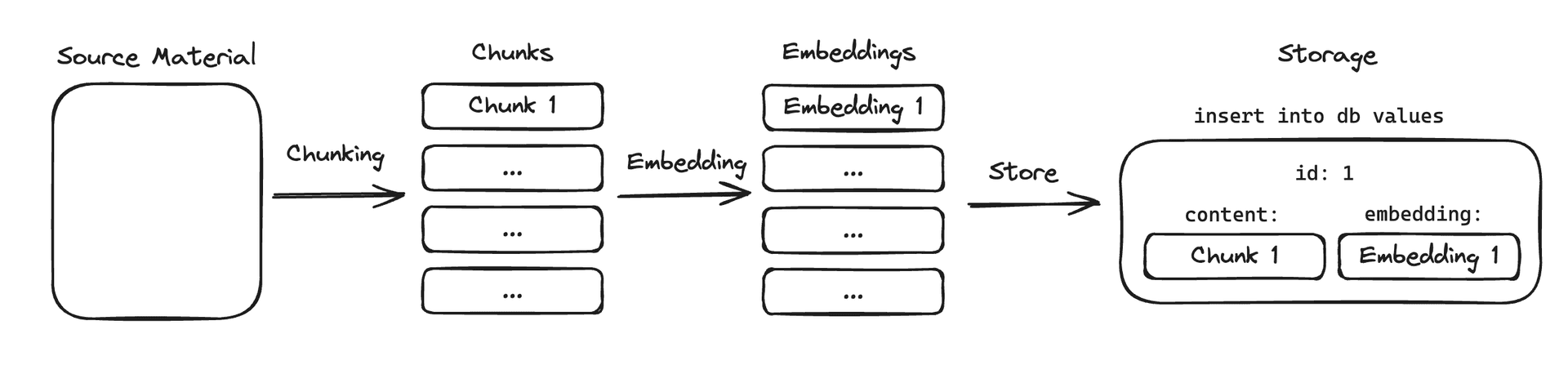 id- unique identifierresourceId- a foreign key relation to the full source materialcontent- the plain text chunkembedding- the vector representation of the plain text chunk