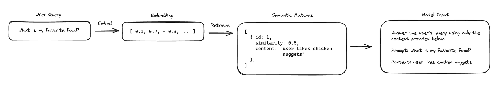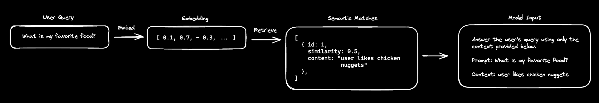 Combining all of this together, RAG is the process of enabling the model to respond with information outside of it’s training data by embedding a users query, retrieving the relevant source material (chunks) with the highest semantic similarity, and then passing them alongside the initial query as context. Going back to the example where you ask the model for your favorite food, the prompt preparation process would look like this.